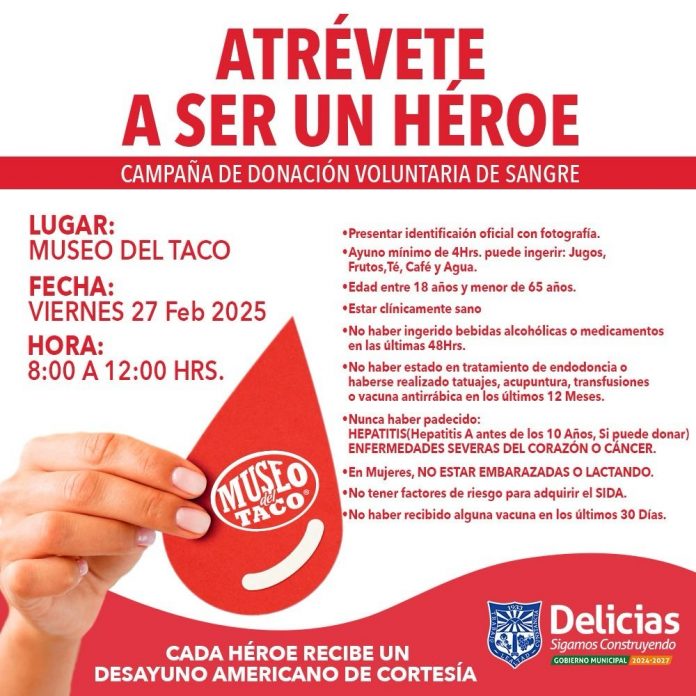 Delicias.- Con el lema “Atrévete a ser un héroe” la Coordinación de Salud Municipal, encabezada por la doctora Francisca Mercado Ávila, invita a la ciudadanía a participar en la campaña de donación voluntaria de sangre, que se llevará a cabo el próximo viernes 27 de febrero de 2025 en el restaurante Museo del Taco de 8 de la mañana a 12:00 horas.