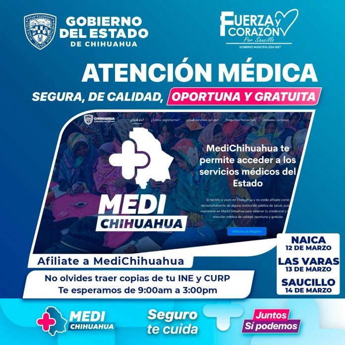 Saucillo.- El presidente municipal de Saucillo, Fito Gardea, hizo un llamado a la ciudadanía para aprovechar la oportunidad de afiliarse al programa de salud Medi-Chihuahua, una iniciativa impulsada por la gobernadora Maru Campos que garantiza el acceso a servicios médicos, atención especializada y medicamentos de calidad para las familias chihuahuenses.