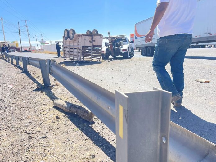 Delicias.- Un accidente de tránsito ocurrió esta tarde cerca de la carretera Federal 45, cuando una traila que transportaba un semoviente se desprendió del vehículo que la jalaba y volcó.