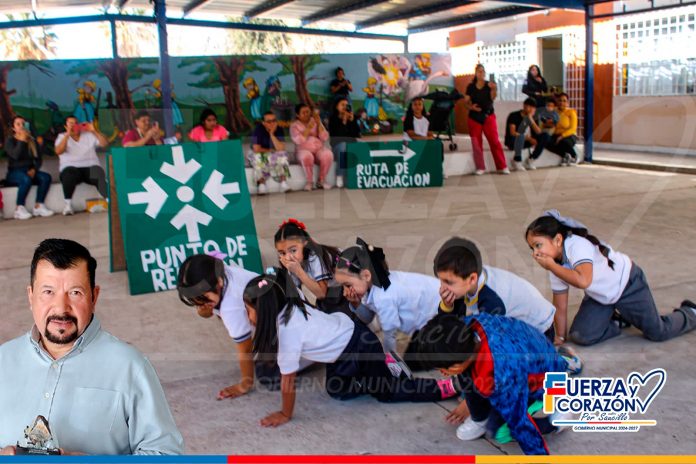 Saucillo.- Como parte de las actividades del programa de Inducción a Desastres en tu Comunidad (INDECO), el Gobierno Municipal de Saucillo, encabezado por el presidente municipal Fito Gardea, a través del departamento de Protección Civil, llevó a cabo el programa “Mi Primer Simulacro” en el jardín de niños AGAZZI, ubicado en la comunidad de Loma Chica.