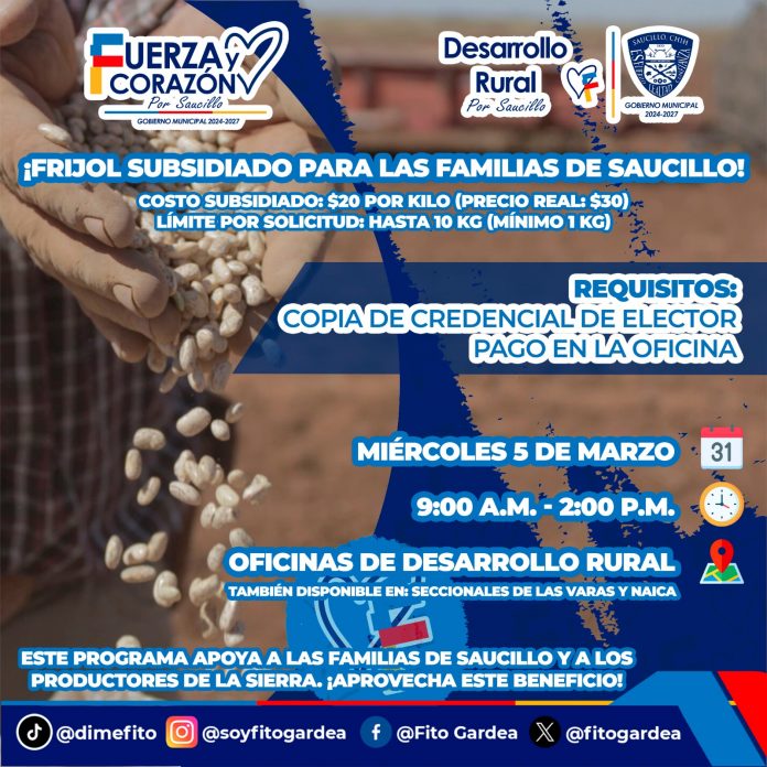 El programa se llevará a cabo en las oficinas de Desarrollo Rural de Saucillo en un horario de 9:00 a.m. a 2:00 p.m., y también estará disponible en los seccionales de Las Varas y Naica. Gracias a este subsidio, los ciudadanos podrán adquirir frijol a un costo de $20 pesos por kilo, en lugar del precio real de $30 pesos.