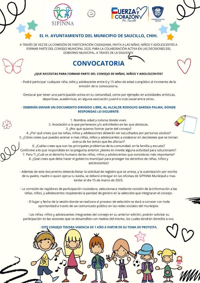 Saucillo.- Con el compromiso de fomentar la participación infantil y juvenil en la toma de decisiones que les afectan, el presidente municipal de Saucillo, Fito Gardea, a través del Sistema de Protección Integral para Niñas, Niños y Adolescentes (Sipinna) Saucillo, ha lanzado la convocatoria para integrar el Consejo de Niñas, Niños y Adolescentes del municipio.