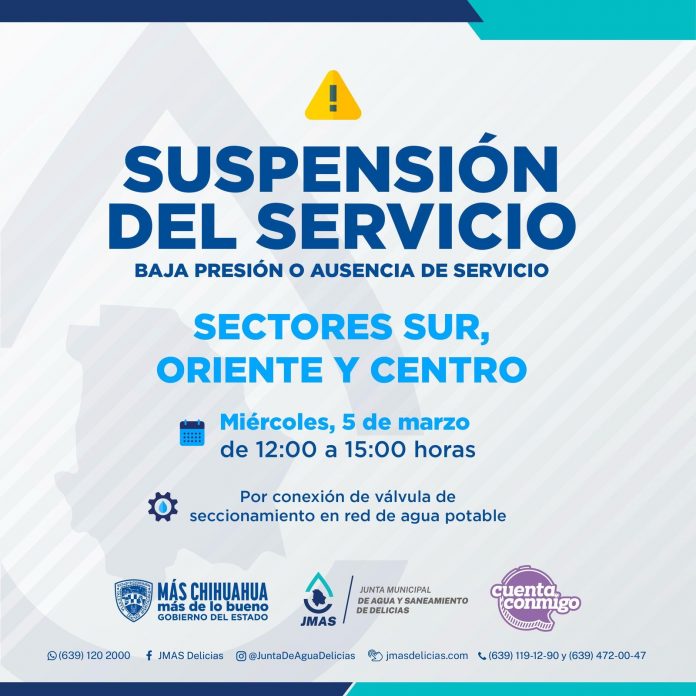 Delicias.- La Junta Municipal de Agua y Saneamiento (JMAS) de Delicias informó que suspenderá el servicio de agua potable en los sectores sur, oriente y centro de la ciudad este miércoles 5 de marzo, de 12:00 a 15:00 horas.