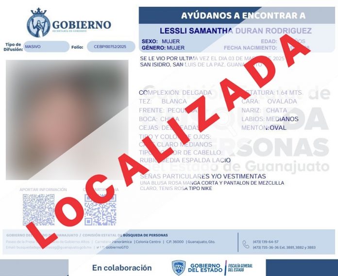 Chihuahua.- Personal de la Comisión Local de Búsqueda de la Fiscalía Especializada en Investigación de Violaciones de Derechos Humanos y Desaparición Forzada con representación en la zona norte del estado, reportó la localización de la adolescente identificada con las iniciales L. S. D. R. de 17 años de edad, quien era buscada en el estado de Guanajuato desde el pasado 03 de marzo de 2025.
