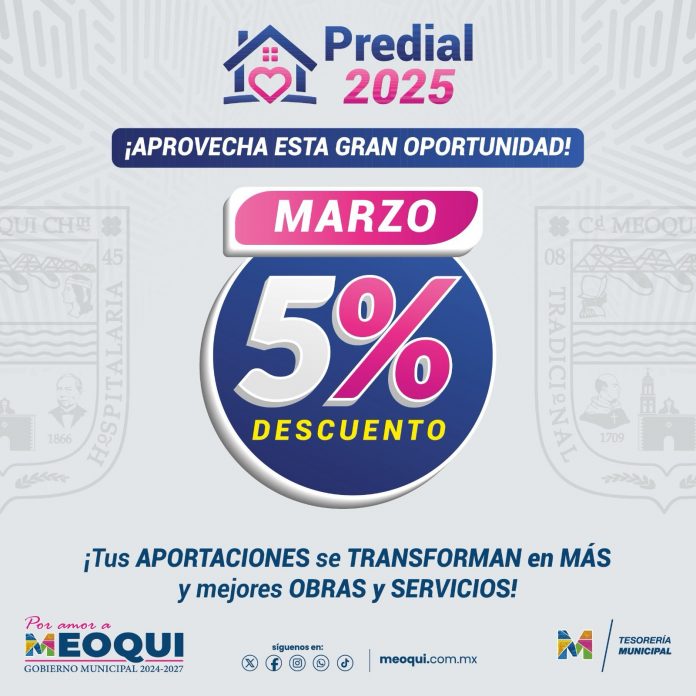En marzo 5% de descuento en el Pago del Predial en Meoqui, participan en el sorteo del usuario cumplido