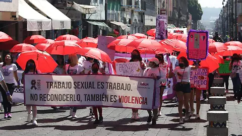 La mañana de este 8 de marzo, la entrada del Hotel México lució llena de sexoservidoras con sombrillas rojas, símbolo de la lucha por el trabajo sexual. Las mujeres tomaron las principales calles del Centro Histórico del municipio de Puebla, para exigir respeto por el oficio que ejercen, principalmente, para mantenerse y tener ingresos económicos que les permitan hacerse cargo de sus hijos.