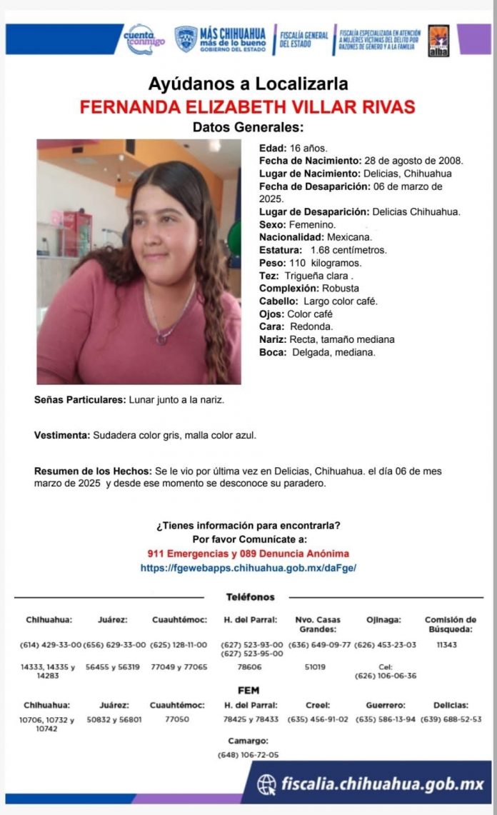 Delicias.- La comunidad de Delicias, Chihuahua, se une en la búsqueda de Fernanda Elizabeth Villar Rivas, una joven de 16 años que desapareció el pasado 6 de marzo de 2025.