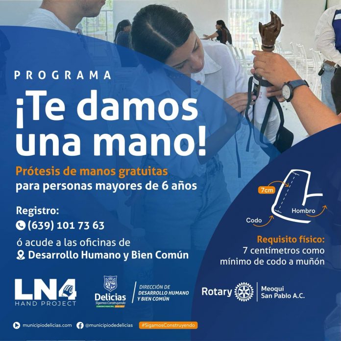 Delicias.- El Gobierno Municipal de Delicias que encabeza el alcalde Jesús Valenciano García, a través de la Dirección de Desarrollo Humano y Bien Común, en coordinación con LN4 Hand Project y el Club Rotario Meoqui San Pablo A.C., invitan a aprovechar el programa “Te damos una mano”, el cual ofrece prótesis de manos gratuitas para personas mayores de seis años que lo necesiten.