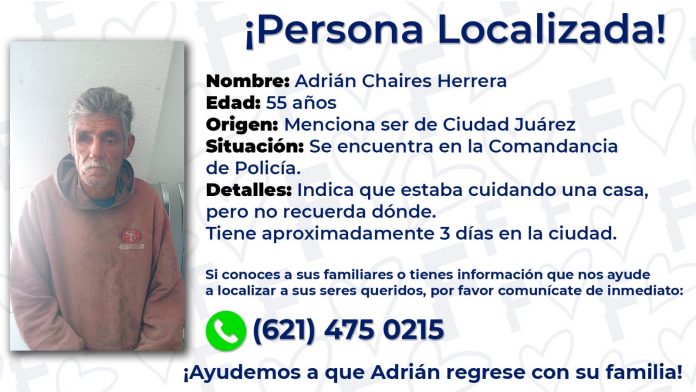 El hombre, identificado como Adrián Chaires Herrera, de 55 años, mencionó ser originario de Ciudad Juárez. Según su declaración, estaba cuidando una casa en la ciudad, pero no recuerda dónde se encuentra.