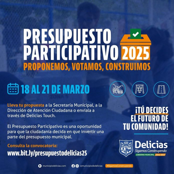 Delicias.- El Gobierno Municipal de Delicias lanzó la convocatoria para el Presupuesto Participativo 2025, un mecanismo que permite a la ciudadanía proponer y decidir en qué proyectos se invertirá una parte del presupuesto público. Con el lema “Proponemos, Votamos, Construimos”, este ejercicio busca fortalecer la participación social y mejorar la infraestructura y servicios de la comunidad a través de propuestas ciudadanas.