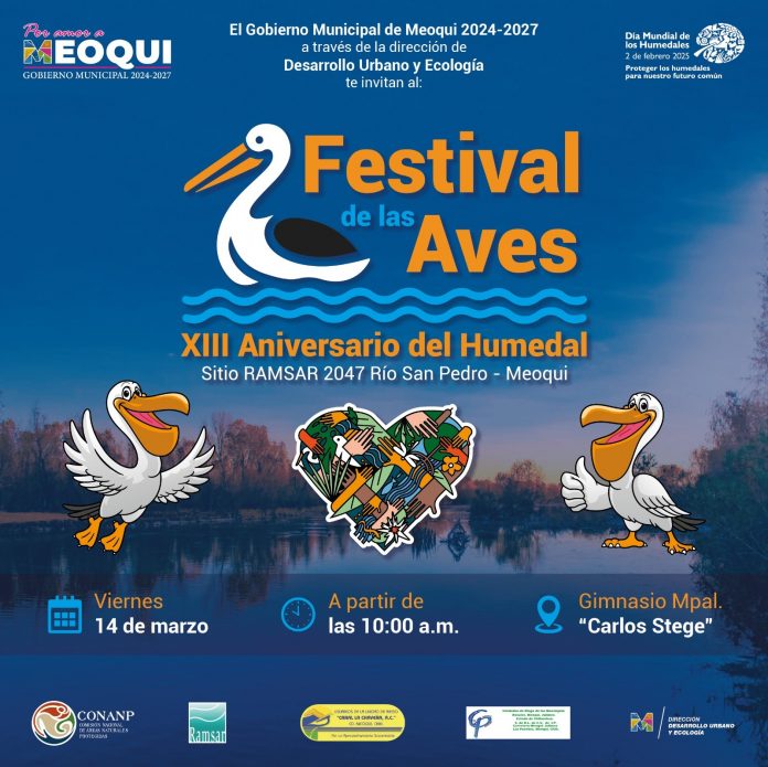 Meoqui.- El próximo 14 de marzo, se llevará a cabo el Festival de las Aves en Meoqui, evento que celebra la biodiversidad del Sitio Ramsar 2047 Río San Pedro. Evento anual que destaca la importancia de la biodiversidad del municipio en el marco del Día Mundial de los Humedales y el XIII aniversario de este ecosistema protegido a nivel internacional.