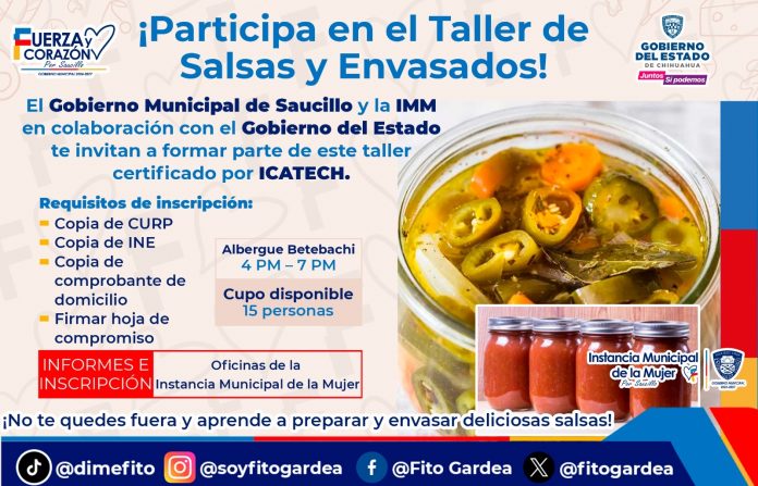 Saucillo.- El presidente municipal de Saucillo, Fito Gardea, a través de la Instancia Municipal de las Mujeres (IMM), invita a la ciudadanía a participar en el Taller de Salsas y Envasados, una oportunidad para adquirir nuevos conocimientos y recibir una certificación oficial avalada por el Instituto de Capacitación para el Trabajo del Estado de Chihuahua (ICATECH).