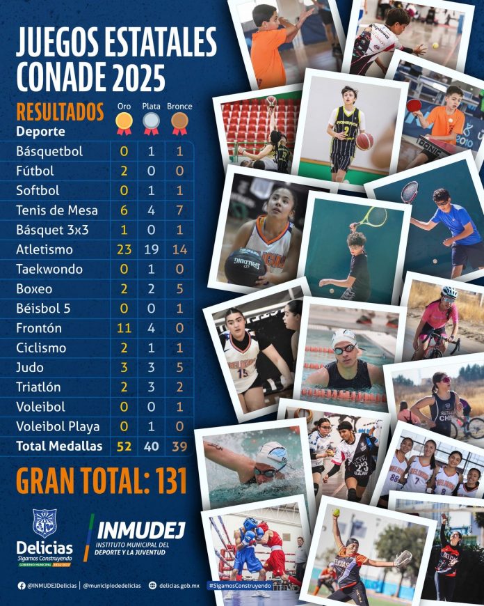 Delicias.- La delegación de Delicias tuvo una participación extraordinaria en los Juegos Estatales CONADE 2025, logrando un total de 131 medallas: 52 de oro, 40 de plata y 39 de bronce. Con este resultado, los atletas locales demostraron su alto nivel competitivo y posicionaron a la ciudad como una de las más fuertes en el ámbito deportivo estatal.