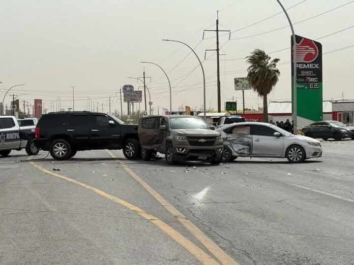 Chihuahua.- Un tiroteo en plena vía pública desató el pánico en Ciudad Juárez durante el mediodía de hoy. Un conductor de una camioneta GMC Yukon fue alcanzado por una ráfaga de balas mientras conducía, lo que lo llevó a perder el control del vehículo y chocar contra otros dos automóviles.