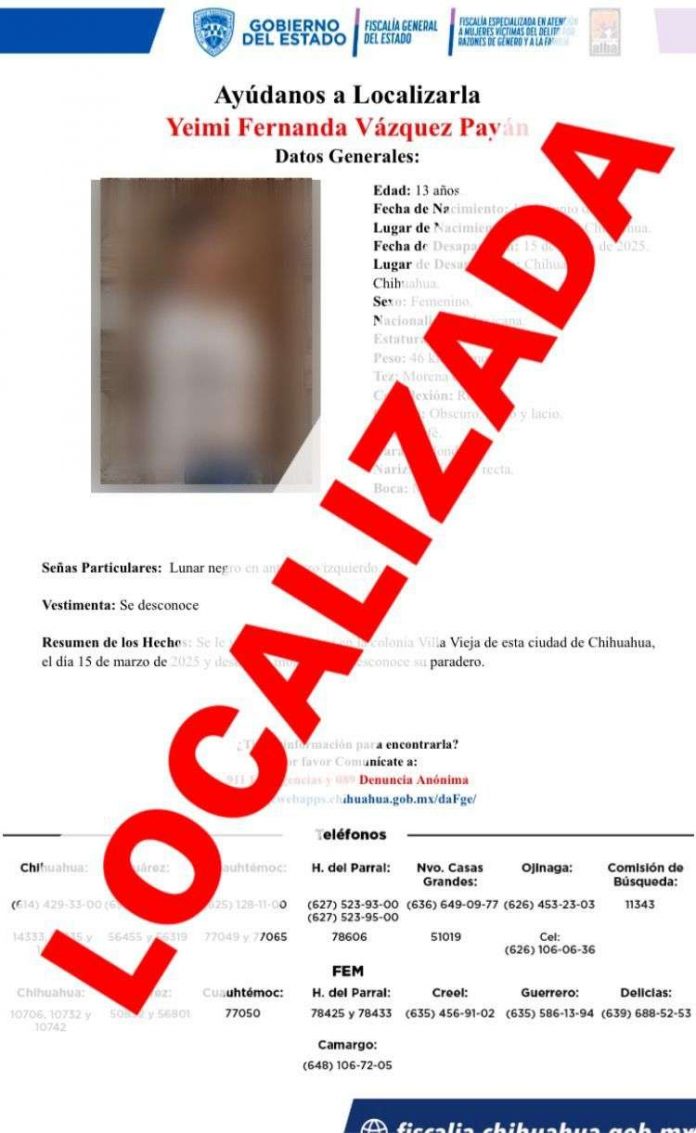 Fue reportada como ausente el pasado sábado 15 de marzo, al ser vista por última vez en la colonia Villa Vieja en la ciudad de Chihuahua y fue localizada ayer domingo por elementos de la Agencia Estatal de Investigación.