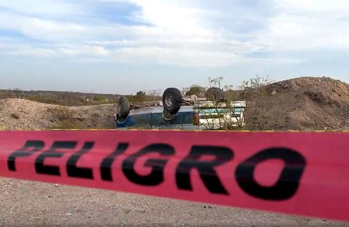 Según informes, la troca de marca Ford, color blanco con azul, chocó con otro vehículo antes de volcar y caer en un hoyo, quedando con las llantas para arriba.