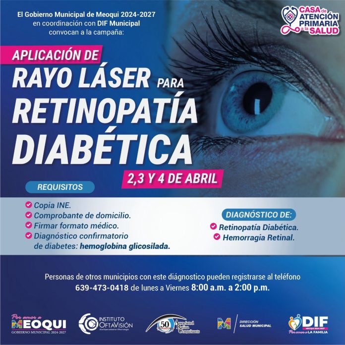 En el municipio de Meoqui, se encuentran disponibles lugares para la aplicación gratuita de láser contra retinopatía diabética, la cual se ofrece para todos los habitantes de la Región Centro Sur, es por ello que el DIF Municipal, extiende la invitación a todas personas, quienes cuenten con un diagnóstico confirmado registrarse para la valoración sin necesidad de un filtro previo y ser candidatos para la aplicación de este procedimiento.
