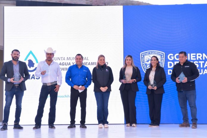 Durante la ceremonia, la mandataria en compañía del director ejecutivo de la JMAS, Alan Falomir, entregaron placas de reconocimiento a los empresarios chihuahuenses que participan en el proyecto.