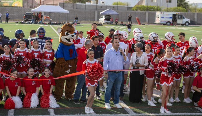 DELICIAS.- El presidente municipal de Delicias, Jesús Valenciano, encabezó la inauguración de las nuevas gradas del campo de fútbol americano de la Prepa 2030, dando inicio al primer juego de la temporada. Este evento marca un avance significativo en la infraestructura deportiva de la institución, reafirmando el compromiso del Gobierno Municipal de Delicias con el fomento al deporte y el bienestar de la juventud.