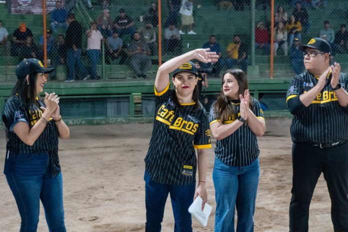 La alcaldesa encabezó el protocolo de arranque en el juego entre Café Bro´s Invedesa Meoqui y Vaqueros de Saucillo