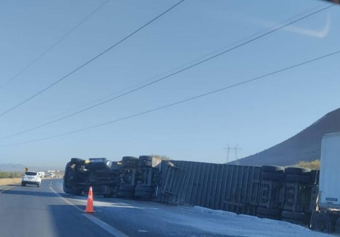 Delicias.- Un aparatoso accidente se registró esta mañana en la carretera Chihuahua-Delicias, donde un tráiler de doble remolque cargado de equipo médico se volcó después de que el conductor perdiera el control de la unidad.