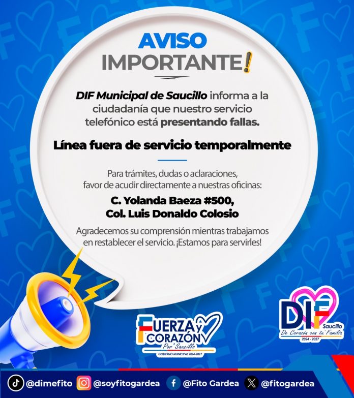 Saucillo.- El presidente municipal, Fito Gardea, informó a la ciudadanía que la línea telefónica del DIF Municipal presenta fallas técnicas, por lo que la atención a la población se brindará únicamente de manera presencial en las oficinas ubicadas en Calle Yolanda Baeza #500, Col. Luis Donaldo Colosio.