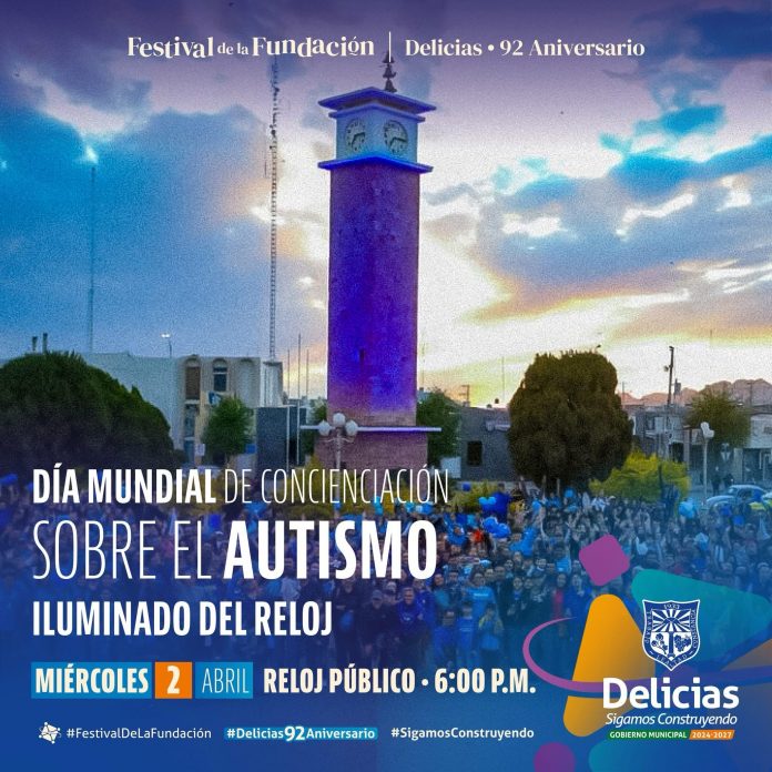 Daniela Rodarte, jefa de Eventos informó que la cita es este miércoles 2 de abril, comenzando a las 6 de la tarde en el Reloj Público, donde se llevará a cabo la iluminación simbólica de color azul con motivo del Día Mundial de Concienciación sobre el Autismo, previo a eso se realizará una caminata que iniciará en Safari Deportivo y concluirá en el Reloj, sumando a Delicias a esta causa internacional que busca visibilizar y fomentar la inclusión de las personas dentro del espectro autista.