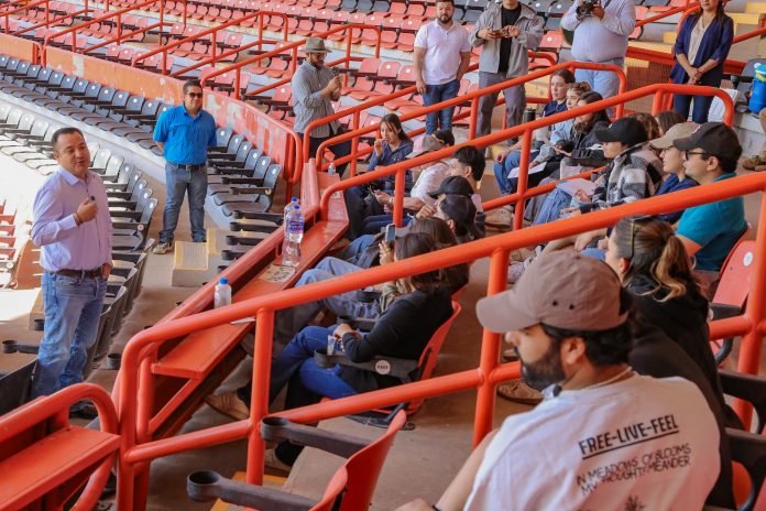 Delicias.- Un grupo de estudiantes del Tecnológico de Monterrey visitó Delicias para iniciar los trabajos de reconocimiento del terreno donde se proyecta construir el futuro Parque Metropolitano, en la zona que rodea el Gran Estadio de Béisbol, como parte del convenio de colaboración impulsado por el presidente municipal Jesús Valenciano García.