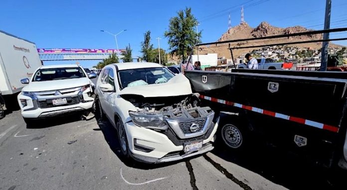 Chihuahua.- Una aparatosa carambola que involucró a seis vehículos provocó caos vehicular la mañana de este miércoles sobre la avenida Pacheco, en el sentido de norte a sur, a la altura de la calle Urueta. El incidente dejó como saldo a una mujer con lesiones leves y cuantiosos daños materiales.
