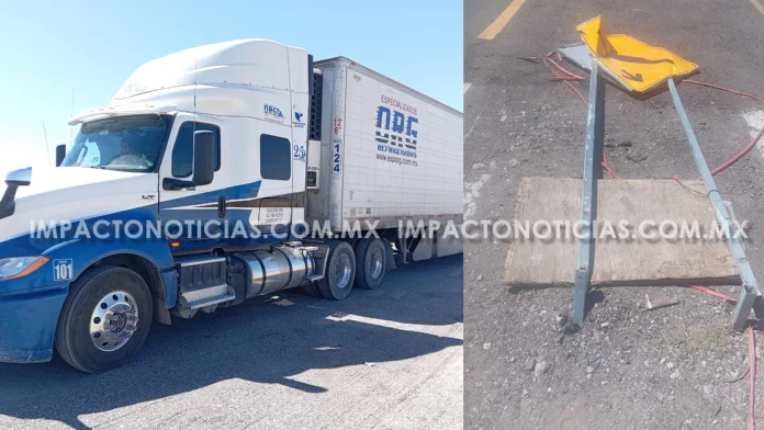 El hecho se reportó cerca de las 2 de la tarde, en el kilómetro 72 de la carretera Camargo a Delicias, justo en los reductores de velocidad de la caseta Fitosanitaria, donde un tráiler de color azul con blanco, impactó contra el señalamiento del reductor de velocidad, propiedad de Gobierno del Estado.