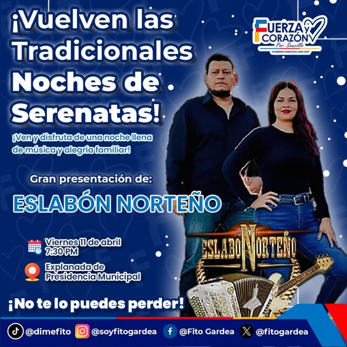El arranque de esta actividad será este viernes 11 de abril, en la explanada de la Presidencia Municipal, en un horario de 7:30 p.m. a 9:30 p.m., contando con la participación especial del grupo norteño Eslabón Norteño, que pondrá el ambiente con lo mejor de su repertorio.