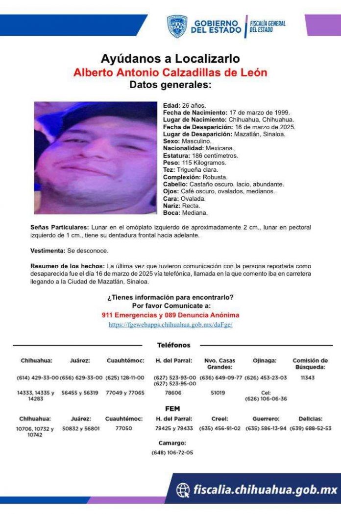 Chihuahua.- El joven Alberto Antonio Calzadillas de León, de 26 años de edad, desapareció al viajar de esta ciudad a Mazatlán, Sinaloa, reportó la Fiscalía General del Estado.