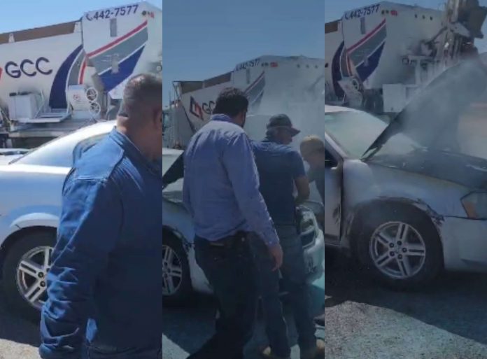 Chihuahua.- Un vehículo se incendió a la altura del kilómetro 17 de la carretera Chihuahua a Aldama, en el viajaba una mujer con tres menores, dos de ellos con capacidades especiales.