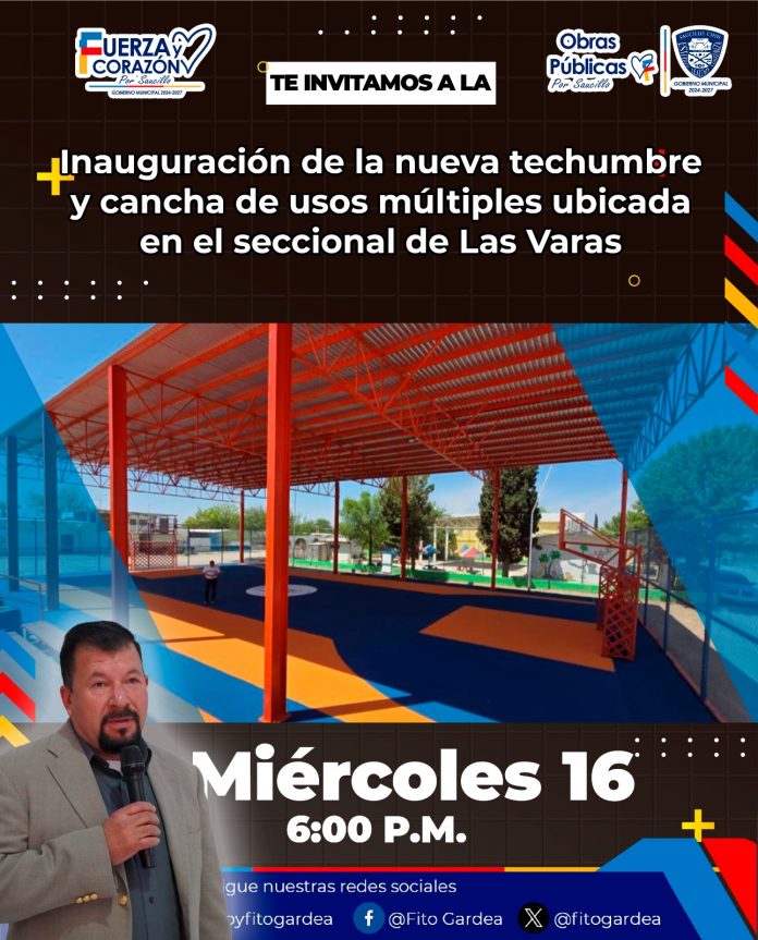 Saucillo.- El presidente municipal de Saucillo, Fito Gardea, hace una cordial invitación a toda la ciudadanía a la gran inauguración de la nueva techumbre y cancha de usos múltiples en el seccional de Las Varas, un espacio completamente renovado que contribuirá al desarrollo deportivo y social de la comunidad. La cita es este miércoles 16 de abril en punto de las 6:00 de la tarde, donde se contará con la presencia de vecinos, autoridades y familias del municipio.