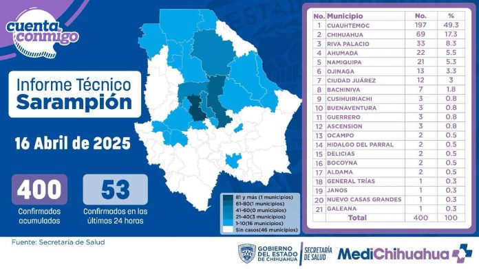 Chihuahua.- La Secretaría de Salud, a través del Departamento de Epidemiología, dio a conocer que hasta el 16 de abril se tiene un registro de 400 casos confirmados de sarampión en el estado y una persona fallecida.