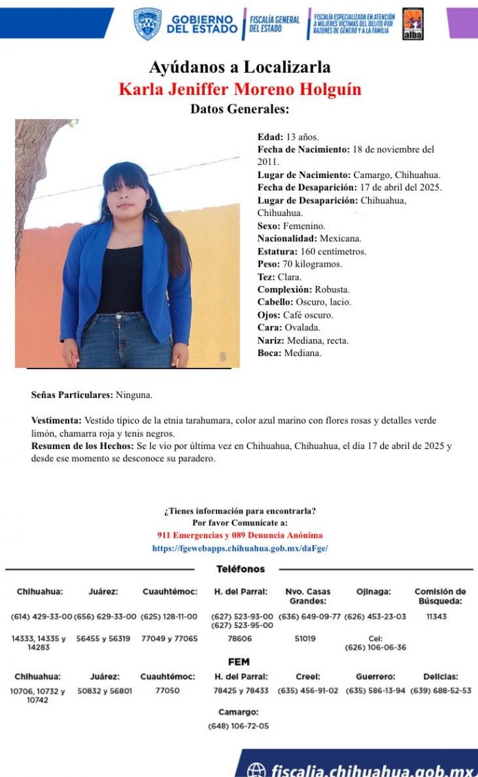 Camargo.- La Fiscalía del Estado de Chihuahua solicita la colaboración de la ciudadanía para localizar a Karla Jeniffer Moreno Holguín, de 13 años de edad, quien desapareció el pasado 17 de abril de 2025 en la ciudad de Chihuahua.