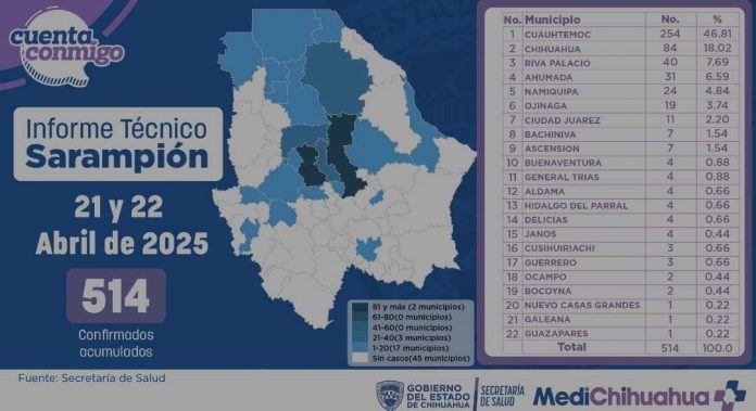 Chihuahua.- La Secretaría de Salud, a través del departamento de Epidemiología, dieron a conocer que hasta el 22 de abril se cuenta con un reporte de 514 casos registrados de sarampión en el estado y una persona fallecida.