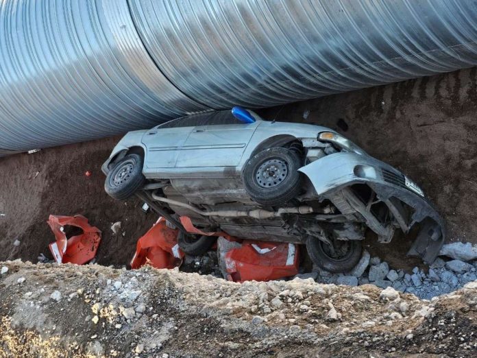 De acuerdo con el reporte de las autoridades, la conductora de un automóvil Nissan Sentra perdió el control del volante y terminó dentro de una excavación destinada a la instalación de tubería para una empresa maquiladora de la zona.