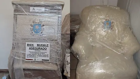 Se trata de un sillón y un reclinatorio que fueron utilizados por el papa Francisco, y que posteriormente se localizaron en una propiedad del ex mandatario chihuahuense.