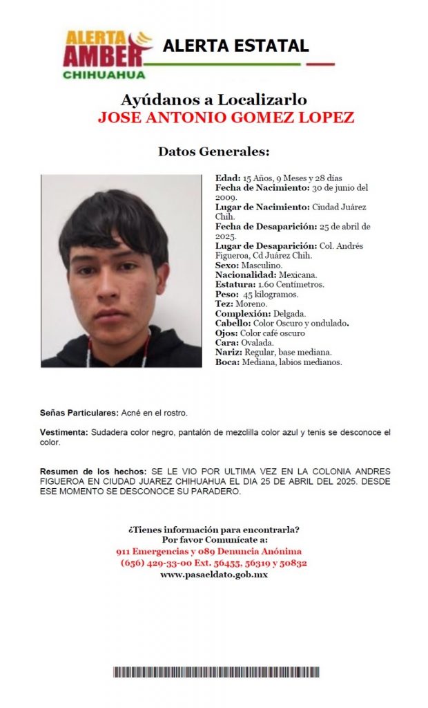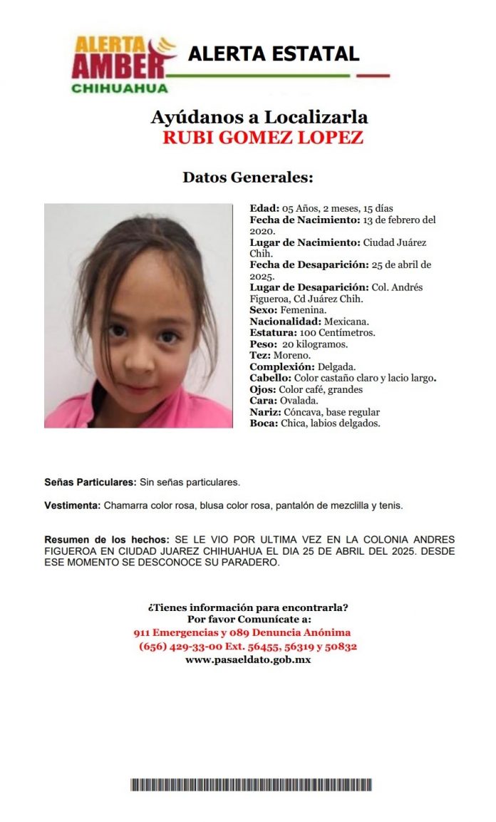 Chihuahua.- La Fiscalía del estado de Chihuahua ha emitido una Alerta Amber para localizar a dos hermanos que desaparecieron en la colonia Andrés Figueroa de Ciudad Juárez. Se trata de Rubí Gómez López, de 5 años, y José Antonio Gómez López, de 15 años, quienes fueron vistos por última vez el 25 de abril de 2025.
