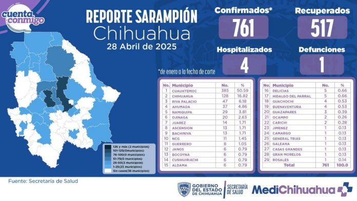 Chihuahua.- La Secretaría de Salud, a través del Departamento de Epidemiología, informó que hasta el 28 de abril se han registrado 761 casos de sarampión en el estado, con un fallecimiento y cuatro personas hospitalizadas.