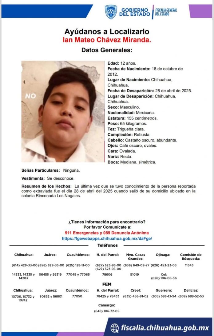 La familia de Ian Mateo Chávez Miranda, un niño de 12 años, está solicitando ayuda para localizarlo después de que desapareciera el 28 de abril de 2025 en la colonia Rinconada Los Nogales en Chihuahua.