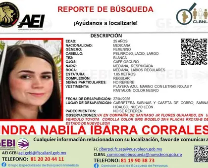 La Fiscalía General de Justicia del estado emitió un reporte de búsqueda por Indra Nabila Ibarra Corrales y Santiago Jr Flores Guajardo. Su fecha de desaparición fue el 27 de abril cuando viajaban en un automóvil Toyota Corolla en color gris modelo 2014 con placas de circulación RXC135-B del estado de Nuevo León.