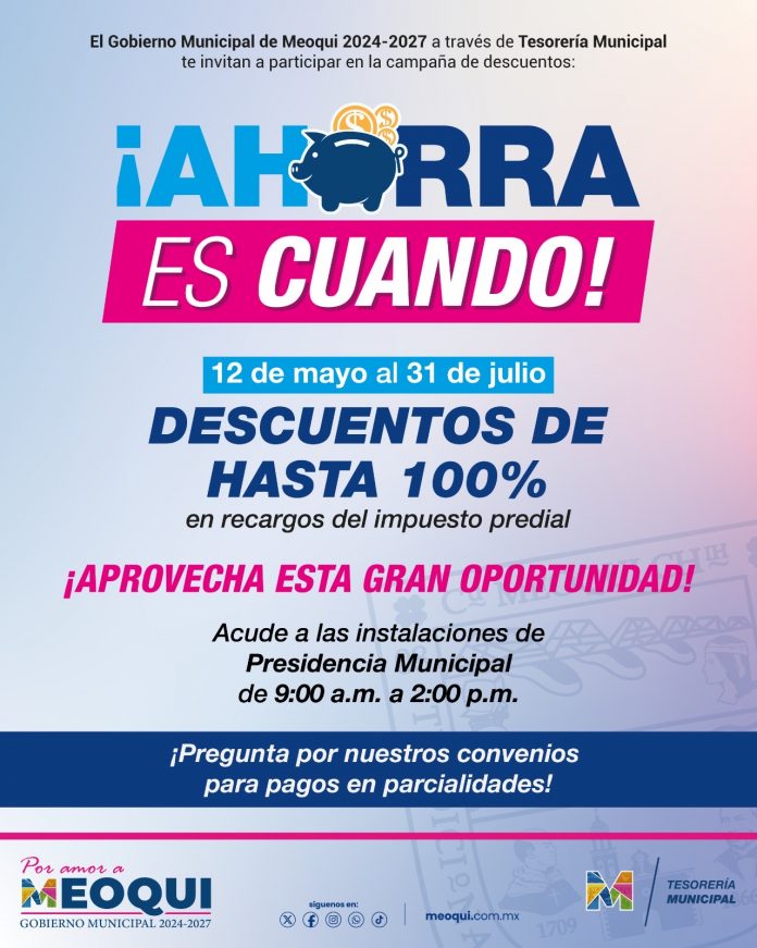 Meoqui.- Del 12 de mayo al 31 de julio del 2025, el Gobierno Municipal de Meoqui, lanzará el programa “Ahorra es Cuando”, con el objetivo de facilitar que los ciudadanos se pongan al corriente en el pago del predial y ofrecerá descuentos de hasta el 100% en recargos del impuesto predial, así como convenios de pago en parcialidades, ya sea en un plazo de dos meses o con pagos distribuidos hasta finales de diciembre del presente año.
