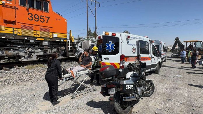 La máquina 3957 del tren circulaba por las vías de sur a norte por el Eje Vial y al llegar al bulevar Zaragoza se le atravesó la camioneta de la Jmas.