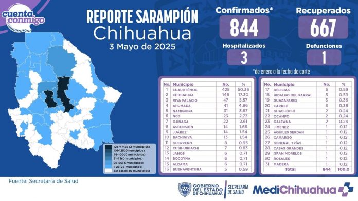 Chihuahua.- En el último corte de casos de sarampión, la Secretaría de Salud informó que el número de contagios se mantiene en 844, con una defunción registrada en la zona norte del estado durante el mes de abril.