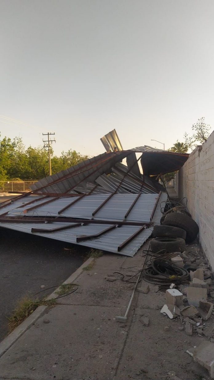 Delicias.- Las ráfagas de viento registradas este lunes en Delicias provocaron la caída de varias láminas en la intersección de la calle Quinta Sur y avenida 21 Sur, donde las autoridades de auxilio de Delicias acudieron de inmediato para brindar apoyo y supervisar que los propietarios del inmueble afectado realizaran maniobras seguras para el retiro de los materiales. Afortunadamente, no se reportaron personas lesionadas.