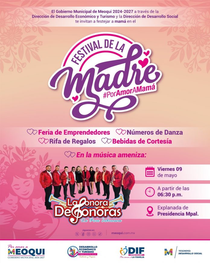Meoqui.- Con rifa de regalos, presentaciones de Danza, Feria de Emprendedores “Produciendo con Amor” y música en vivo a cargo de “La Sonora de Sonoras”, se llevará a cabo este viernes 9 de mayo a partir de las 6:30 de la tarde en la explanada de la Presidencia Municipal de Meoqui, se llevará a cabo el “Festival de la Madre: Por Amor a la Mamá “.