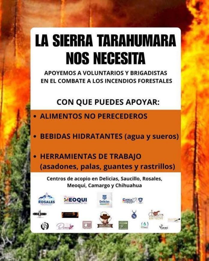 Meoqui.- El municipio de Meoqui se sumó a la campaña regional de apoyo a los brigadistas que trabajan para sofocar los incendios forestales en la Sierra Tarahumara, instalando un centro de acopio para recibir donativos en las oficinas de Desarrollo Urbano y Ecología, así como en el Módulo 7 en el seccional de Lázaro Cárdenas, donde se aceptarán alimentos no perecederos, bebidas hidratantes como aguas y sueros, así como herramientas de trabajo: palas, azadones, guantes y rastrillos.