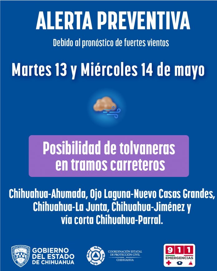 Chihuahua.- La Coordinación Estatal de Protección Civil Chihuahua han emitido una alerta ante ráfagas de viento que podrían superar los 65 km/ el martes 13 y miércoles 14 de mayo.